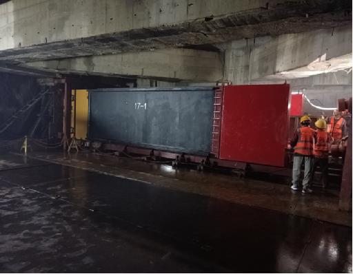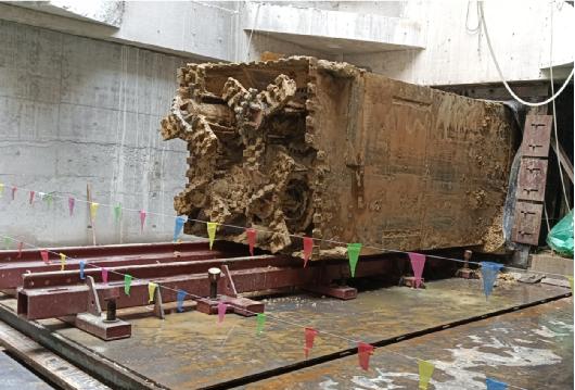 矩形管幕结构段位于仪凤门城楼正下方,与仪凤门呈“正交”关系,沿线有阅江楼、仪凤门、天妃宫、静海寺等建构筑物。矩形管幕结构段总长度为69.84米,其中工作井尺寸为15×27.19米,深度26.51米,管幕顶进段长度37.44米。管幕结构断面21.98×18.67米,设置53根钢管,呈田字型布置。管节有3种,分别为A(2.0×2.0米)、B(2.0×2.3米)、C(2.0×1.6米),本列顺利接收的顶管为B型管。