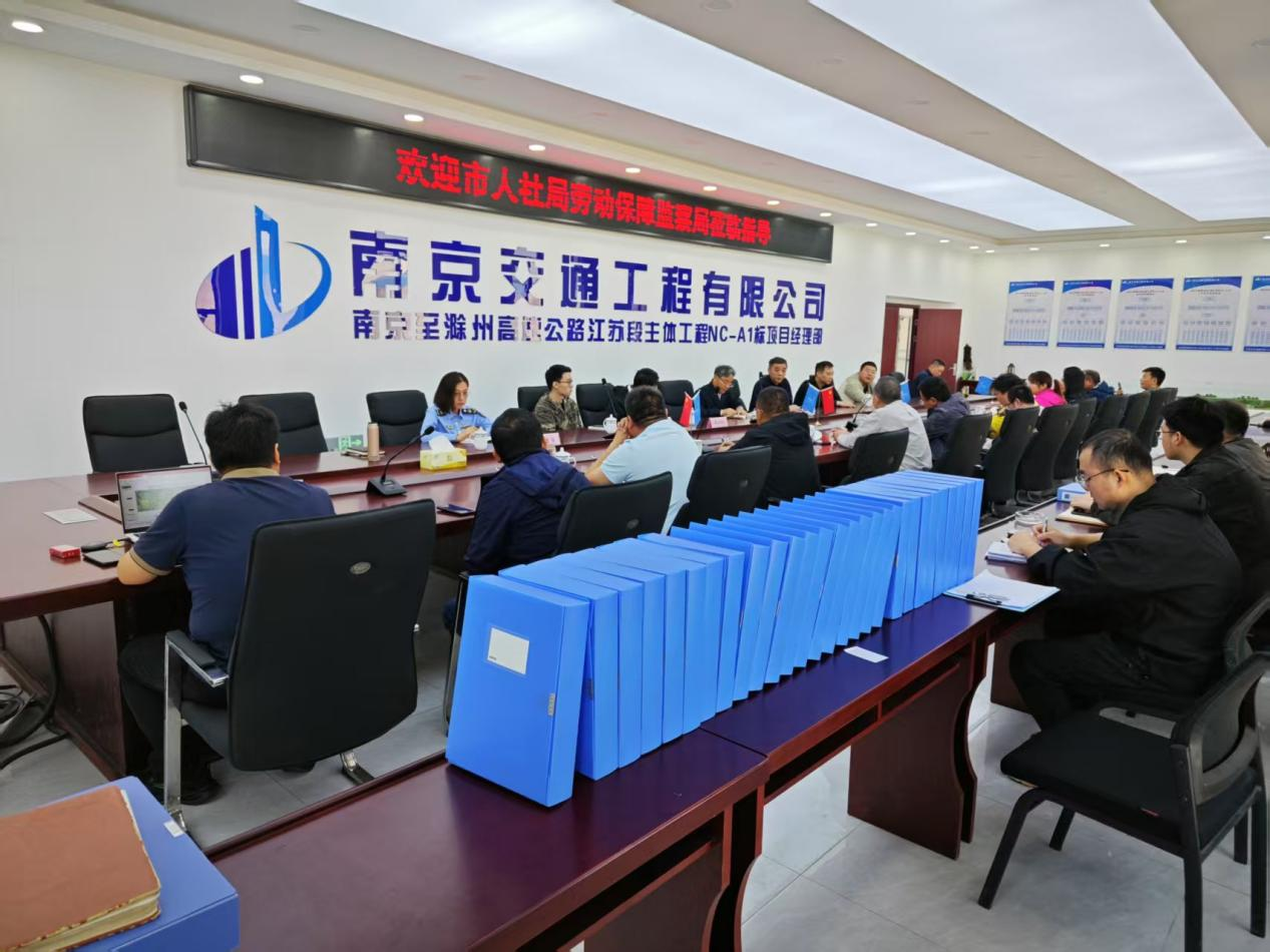 为全面落实《保障农民工工资支付条例》,守护保障农民工按时足额获得劳动报酬,2025年4月25日,南京市人社局劳动保障监察局、南京市交通运输综合行政执法总队六支队及南京市六合区人社局联合对宁滁项目农民工工资支付情况开展专项检查。南京市公共工程建设中心合约处、宁滁项目指挥部及主体施工、监理单位参加了会议。