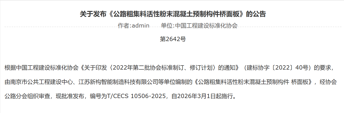 近日,中国工程建设标准化协会公告,由南京市公共工程建设中心、江苏新构智能制造科技有限公司等联合编制的《公路粗集料活性粉末混凝土预制构件桥面板》(T/CECS 10506-2025)审查通过,2026年3月1日起施行,填补公路领域CA-RPC桥面板标准化空白。
