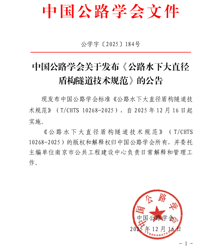 中国公路学会发布公告,《公路水下大直径盾构隧道技术规范》自2025年12月16日实施。