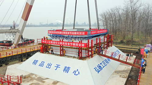 浦仪公路西段跨江大桥首节钢塔于3月1日成功吊装。